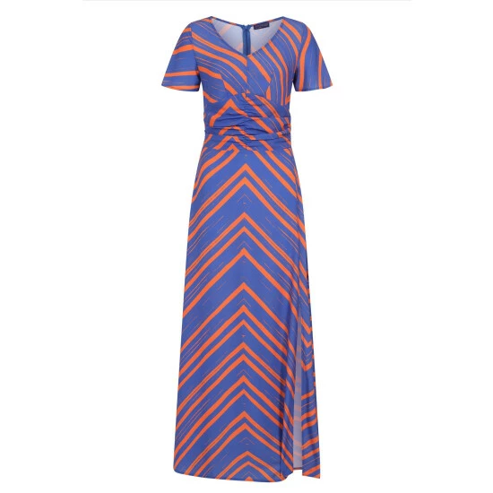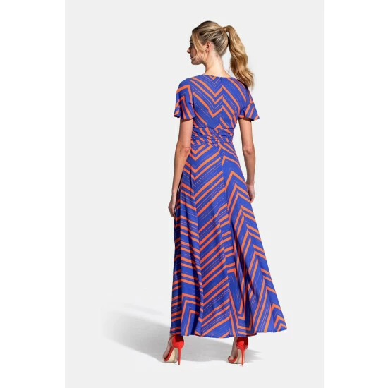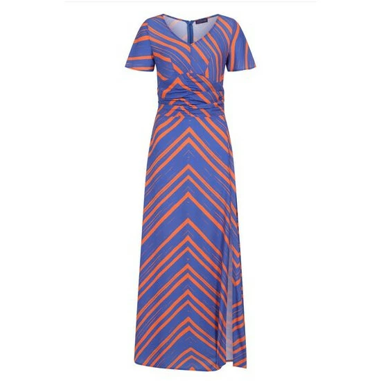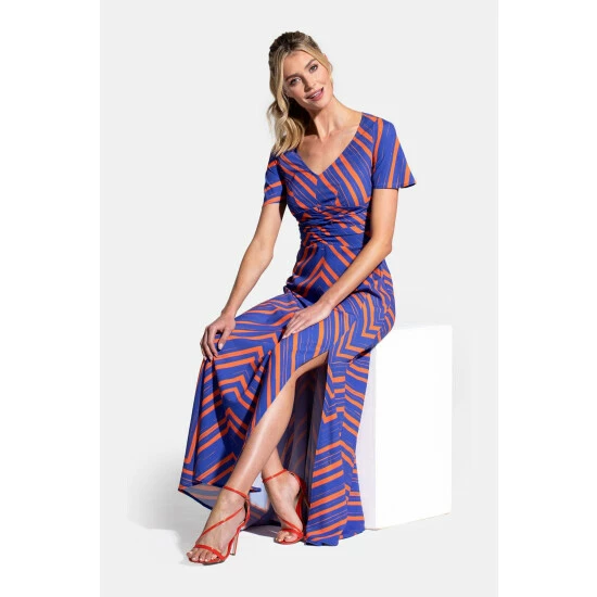 This ultra-soft HotSquash maxi pairs elegant, floor skimming length with short, flared sleeves, a ruched waistline and V-neckline. Made in London in a sophisticated print, it s the perfect companion for overseas adventures. They particularly like the side split, which is perfect for subtly showing off tanned legs!