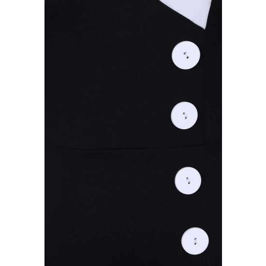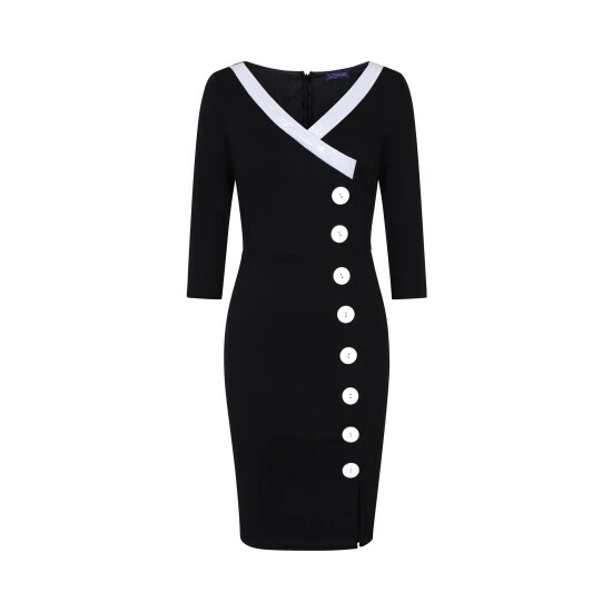 A great addition to every woman’s wardrobe; this is a great party dress, occasion dress or cocktail dress. The colour contrasting button detail gives an interesting feature to this bodycon design and the crease-resistant fabric keeps you looking your best!