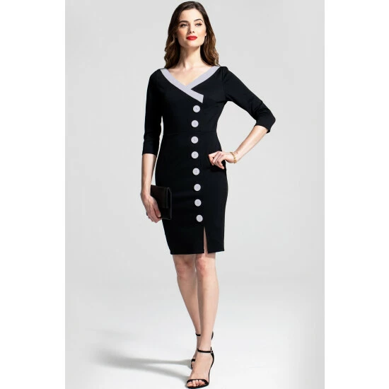 A great addition to every woman s wardrobe; this is a great party dress, occasion dress or cocktail dress. The colour contrasting button detail gives an interesting feature to this bodycon design and the crease-resistant fabric keeps you looking your best!
