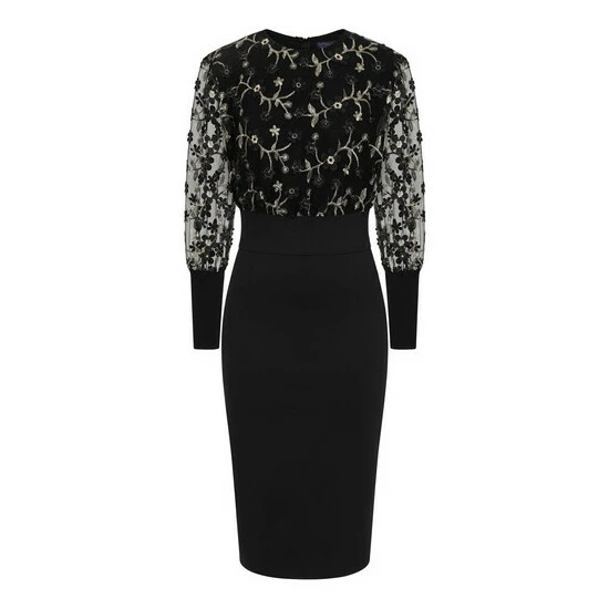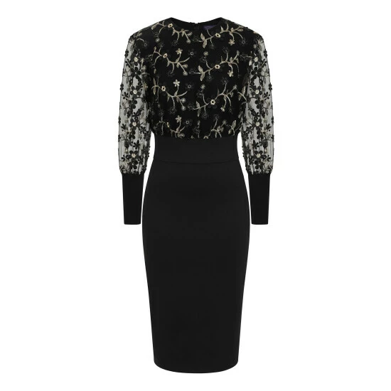 A fitted ponte skirt which gently sculpts the figure plus an elegantly embroidered top, this dress flatters the wearer giving a simply stylish look. If between sizes please size up.