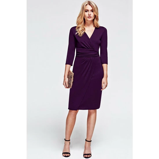 With a feminine V-neck & 3/4 length sleeves this damson faux-wrap dress gives the wearer an effortlessly stylish look. It is also made from temperature-regulating fabric which keeps you warm when it’s cold & cool when it’s warm; perfect for the changeable British climate. Made in London.