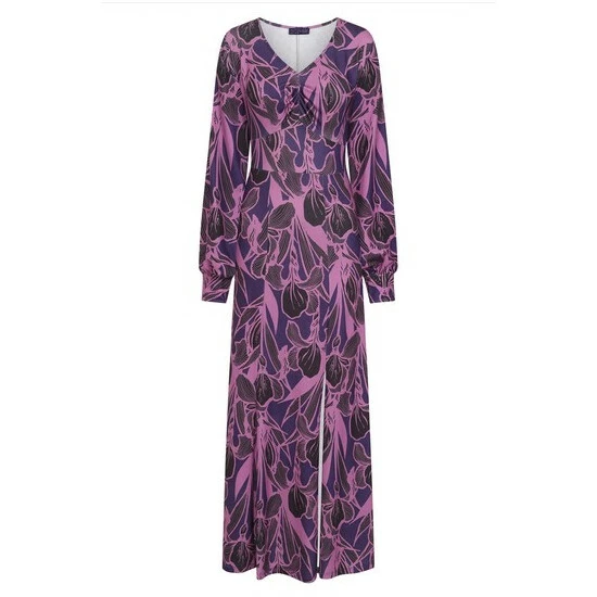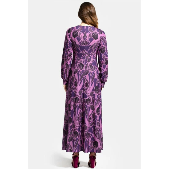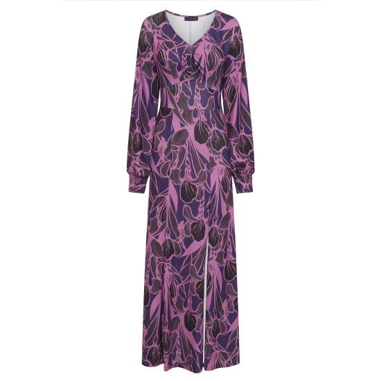This flattering 70s V-neck floral dress has delicate ruching at the bust to give shape and seams which nip you in at the waist. With this season’s blouson sleeves and a skirt split, it’s great for both casual and more formal occasions. It’s quite fitted under the bust, so if you are between sizes please size up.