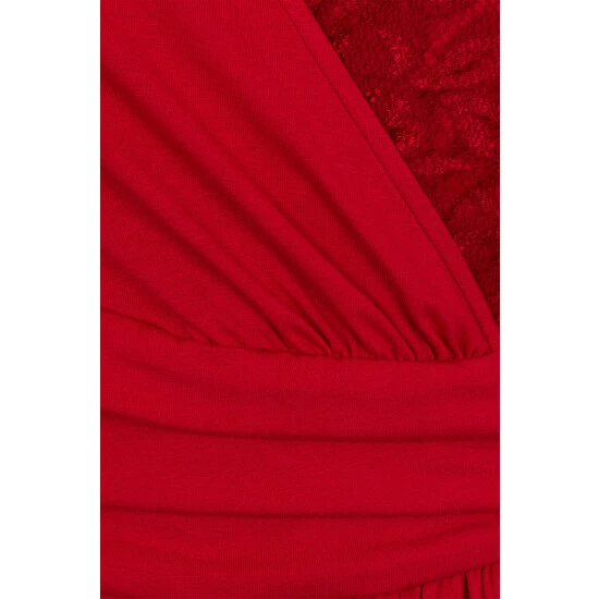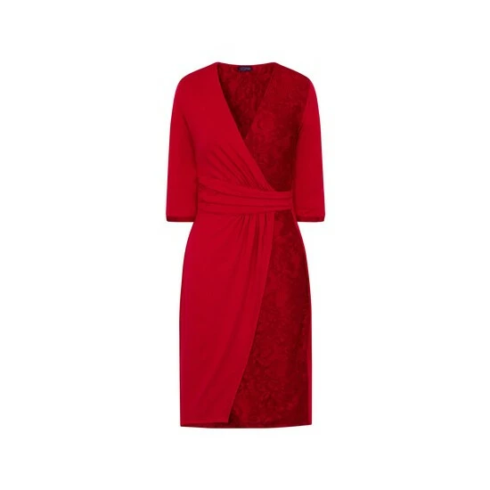 Delicate lace detail gives this flattering HotSquash red faux-wrap dress a sophisticated twist. With a feminine V-neck & 3/4 length sleeves it gives the wearer an effortlessly stylish look. It is also made from temperature-regulating fabric which keeps you warm when it’s cold & cool when it’s warm; perfect for the changeable British climate.