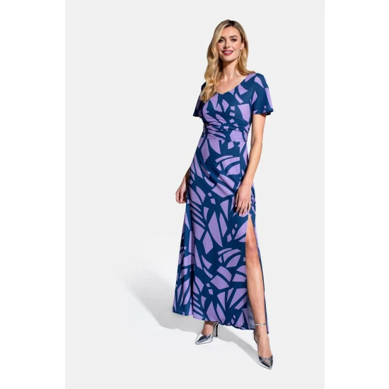 This ultra-soft Hot Squash maxi pairs elegant, floor skimming length with short, flared sleeves, a ruched waistline and V-neckline. Made in London in a sophisticated print, it s the perfect companion for overseas adventures. Hot Squash particularly like the side split, which is perfect for subtly showing off tanned legs!